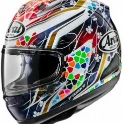 Super fibre and other special synthetic fibres, with superb tensile strength and flexibility characteristics, developed for F-1 helmet visor panel, assembled and bonded by Arai experts, reinforcing across the forehead area (imagine the steel belts used to hold a barrel together) with a variety of carefully stacked and moulded materials. Newly developed resin creates stronger bonds between shell material with less weight.